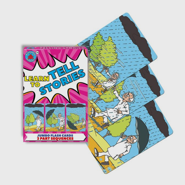 This deck is perfect for children who are speaking in little sentences and need practice to develop longer descriptions and narrative skills. Storytelling skills develop several essential language and cognitive skills such as sequencing, verbal reasoning, and inferencing apart from developing sentence structure and grammar. Use this deck to build 2 or 3 part stories ,depending on your child’s ability and need. As a fun activity, why not try forming your own end to stories?! Resources can help develop your child’s language from the single word level right through to sentences, verbal reasoning and conversational skills. Don’t forget to check out our other flashcard decks to get your child started on her learning journey!